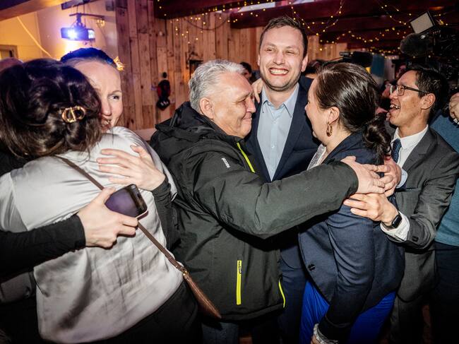 Nuuk (Groenlandia), 12/03/2025.- El presidente de Demokraatit, Jens-Frederik Nielsen, abraza a sus seguidores durante la fiesta electoral de Demokraatit en el Café Killut. / Mads Claus Rasmussen (EFE)