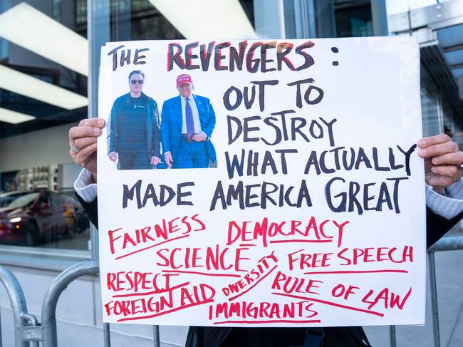MANHATTAN (ESTADOS UNIDOS), 13/03/2025.- Una persona sostiene un cartel durante una manifestación frente a un concesionario de automóviles Tesla. / Ángel Colmenares (EFE)