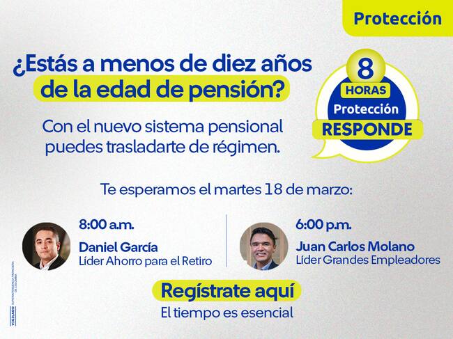 Con el fin de que miles de colombianos se informen y beneficien con la Oportunidad de Traslado, Protección pondrá en marcha un evento virtual llamado ‘Protección Responde’, en el que el martes 18 de marzo, expertos contestarán a cada una de las preguntas que tengan las personas sobre este tema. El evento tendrá dos horarios: