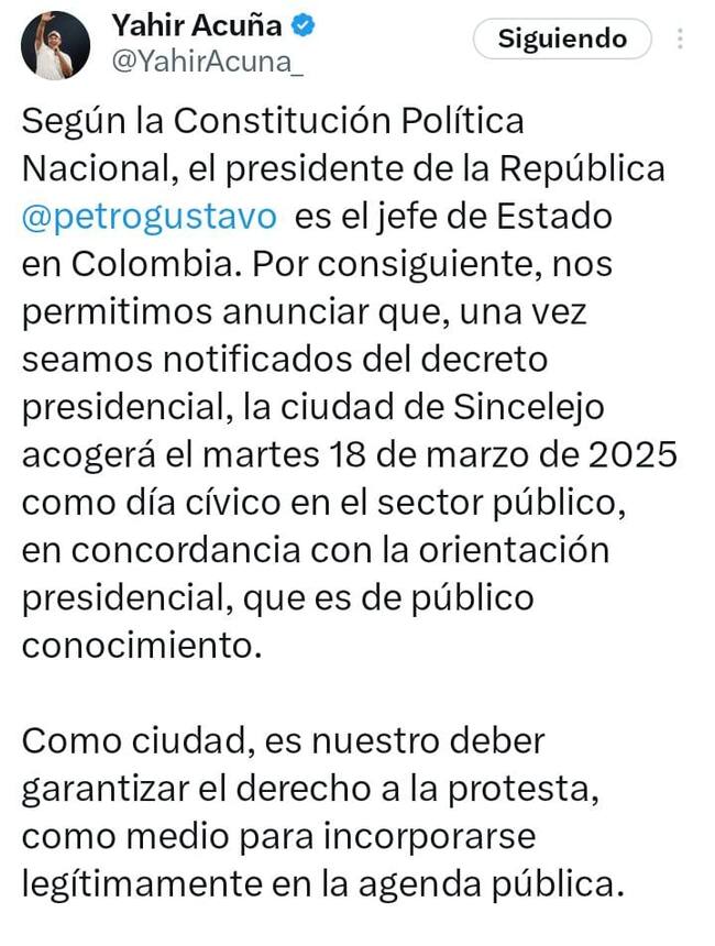 A través de la red social X, el alcalde de Sincelejo, Sucre, Yahir Acuña, dijo que la ciudad se uniría al día cívico decretado por el Gobierno Nacional una vez sean notificados del decreto presidencial.
