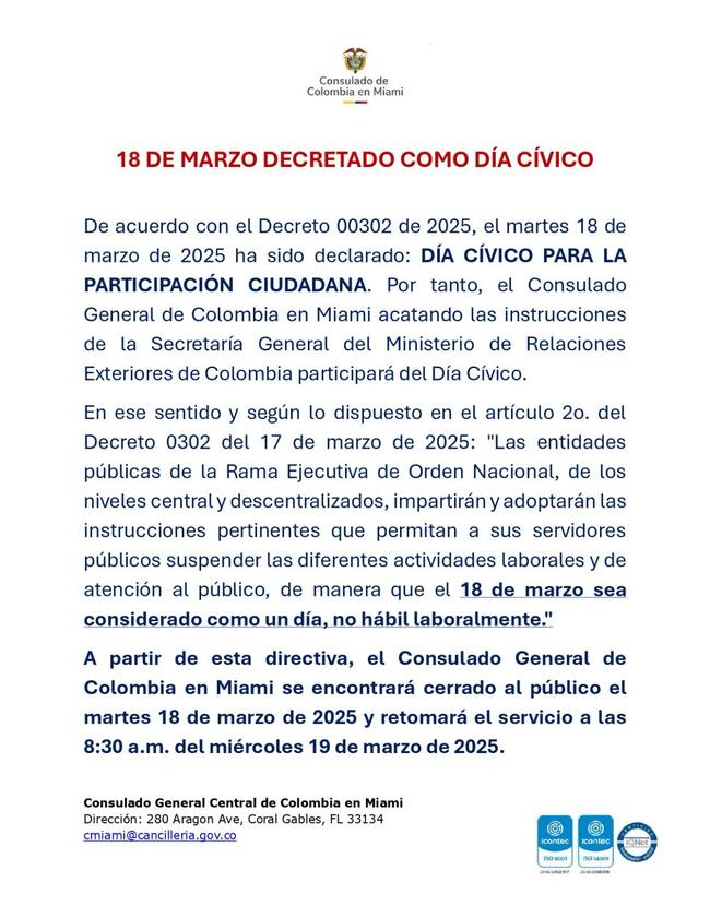 El Consulado de Colombia en Miami, Estados Unidos, confirmó que se unirán al día cívico anunciado por el presidente de la República, Gustavo Petro, y oficializado por el Gobierno Nacional a través del decreto 00302, por lo que no tendrán servicio este martes, 18 de marzo.