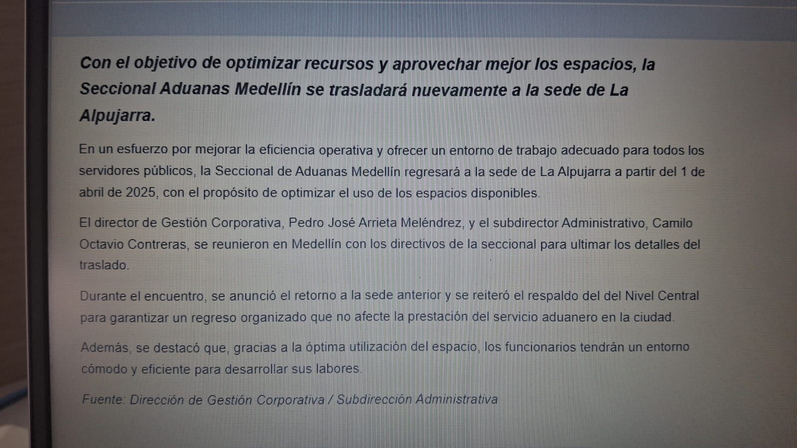A comienzos de año La W reveló que la Dirección de Impuestos y Aduanas Nacionales (Dian) trasladó a 230 funcionarios de Medellín a un lujoso edificio en Envigado por el que tuvo que pagar un millonario arriendo de $2.243 millones de pesos por siete meses, culminando este, con lo cual los empleados denunciaron que se estaría subutilizando su sede propia.