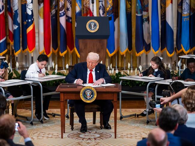 Trump firmó en la Casa Blanca el decreto rodeado por una docena de niños sentados en pupitres que fueron invitados a un evento en el que también estuvieron gobernadores republicanos como Ron DeSantis (Florida), Jeff Landry (Luisiana), Bill Lee (Tennessee) o Kim Reynolds (Iowa), o el congresista, también republicano, Rick Allen.