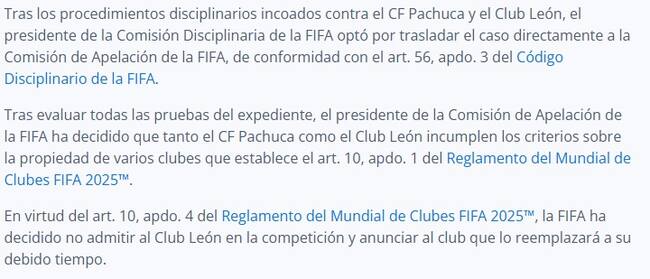 “Tras evaluar todas las pruebas del expediente, el presidente de la Comisión de Apelación de la FIFA ha decidido que tanto el CF Pachuca como el Club León incumplen los criterios sobre la propiedad de varios clubes que establece el art. 10, apdo. 1 del Reglamento del Mundial de Clubes FIFA 2025™"