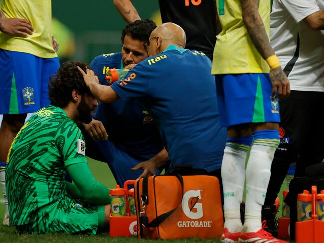 Alisson Becker de Brasil es atendido tras un golpe de cabezas este jueves. Foto: EFE. / ANDRE COELHO (EFE)