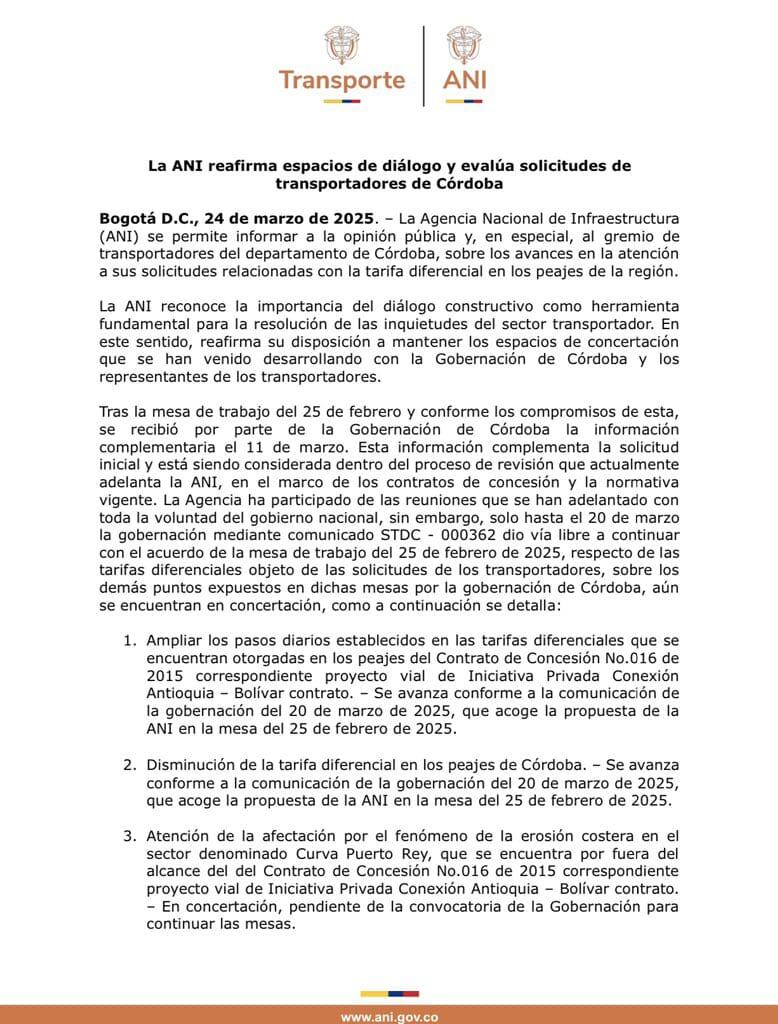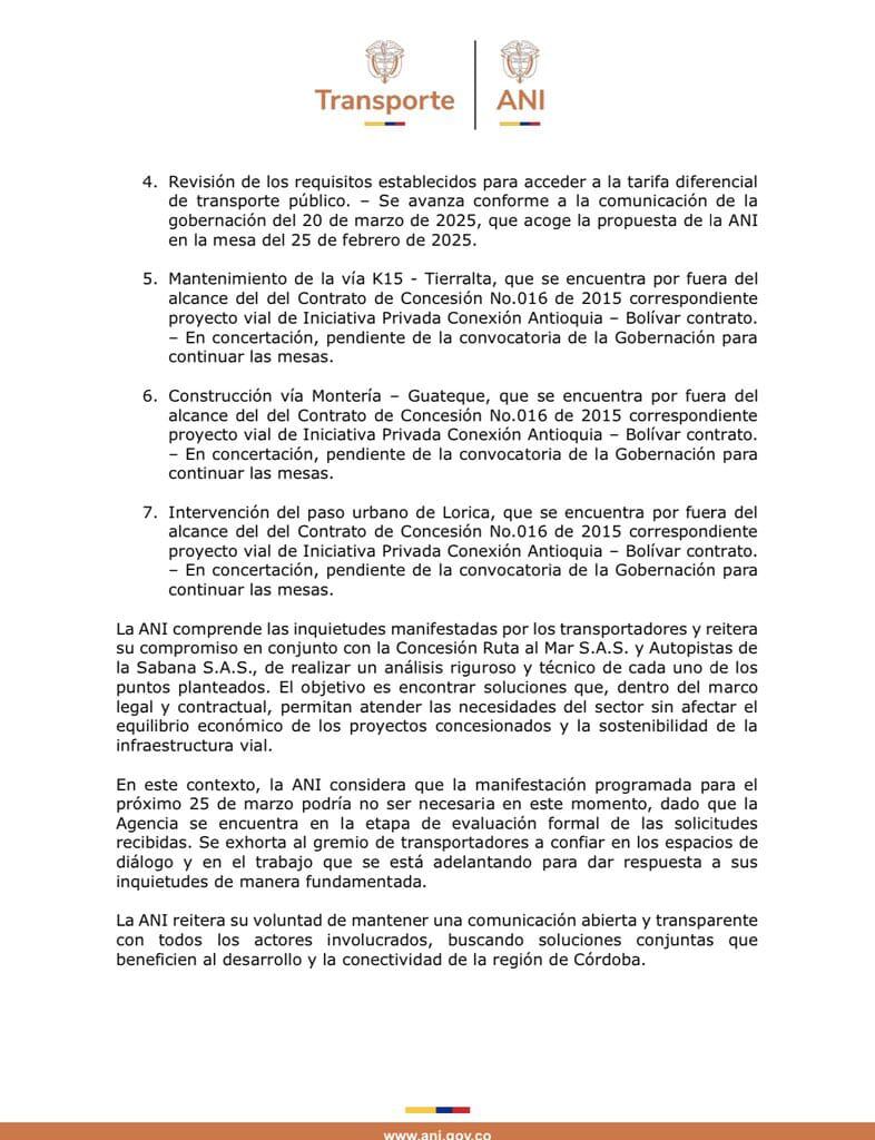Tras la manifestación, la Agencia Nacional Infraestructura (ANI) informó sobre el estado de las siete solicitudes planteadas por los transportadores el pasado 25 de febrero, cuando hubo un primer encuentro con los voceros de este sector, gobernador de Córdoba, Erasmo Zuleta y comunidad en general.