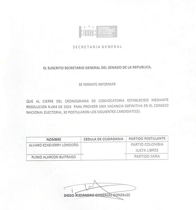 La Secretaría General del Senado ya publicó la lista de candidatos postulados para el cargo que dejó Lorduy, y reemplazarlo como uno de los 9 magistrados. Se trata de un puesto clave, ya que los miembros del CNE estudian el caso del presidente Petro por la presunta financiación irregular de su campaña.