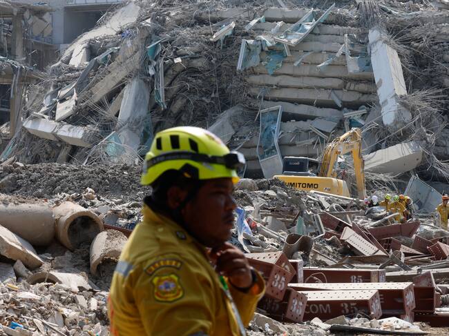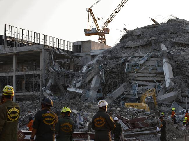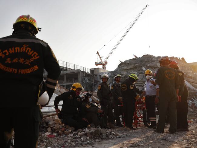 Bangkok (Thailand), 28/03/2025.- Rescue workers search for survivors at the site of a collapsed building following an earthquake in Bangkok, Thailand, 28 March 2025. According to the National Institute for Emergency Medicine, 70 construction workers are missing at the site following a 7.7-magnitude earthquake that struck Myanmar and caused tremors that could be felt in neighboring Thailand. (Terremoto/sismo, Birmania, Tailandia) EFE/EPA/RUNGROJ YONGRIT / RUNGROJ YONGRIT