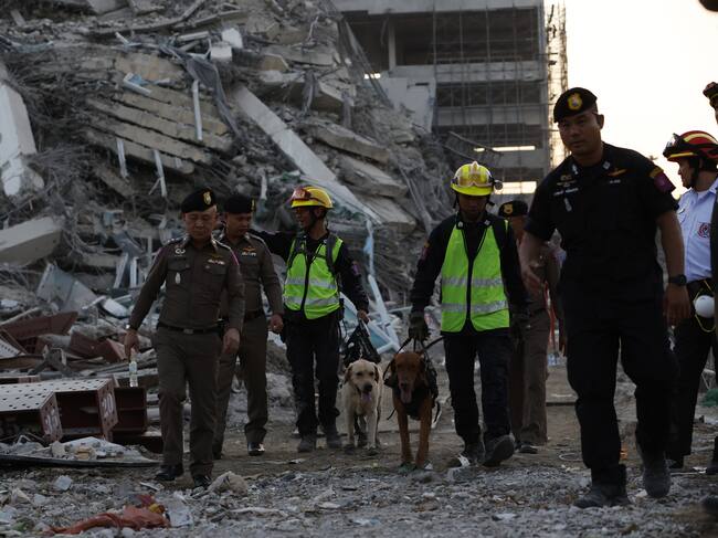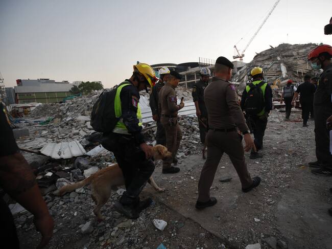 Bangkok (Thailand), 28/03/2025.- Rescue workers search for survivors with sniffer dogs at the site of a collapsed building following an earthquake in Bangkok, Thailand, 28 March 2025. According to the National Institute for Emergency Medicine, 70 construction workers are missing at the site following a 7.7-magnitude earthquake that struck Myanmar and caused tremors that could be felt in neighboring Thailand. (Terremoto/sismo, Birmania, Tailandia) EFE/EPA/RUNGROJ YONGRIT / RUNGROJ YONGRIT