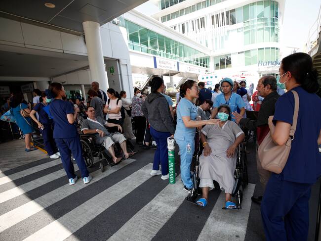 Bangkok (Thailand), 28/03/2025.- Patients and medics are evacuated after an earthquake, at a hospital in Bangkok, Thailand, 28 March 2025. A 7.7-magnitude earthquake struck Myanmar, according to the United States Geological Survey (USGS), with tremors felt in neighboring Thailand. (Terremoto/sismo, Birmania, Tailandia, Estados Unidos) EFE/EPA/RUNGROJ YONGRIT / RUNGROJ YONGRIT