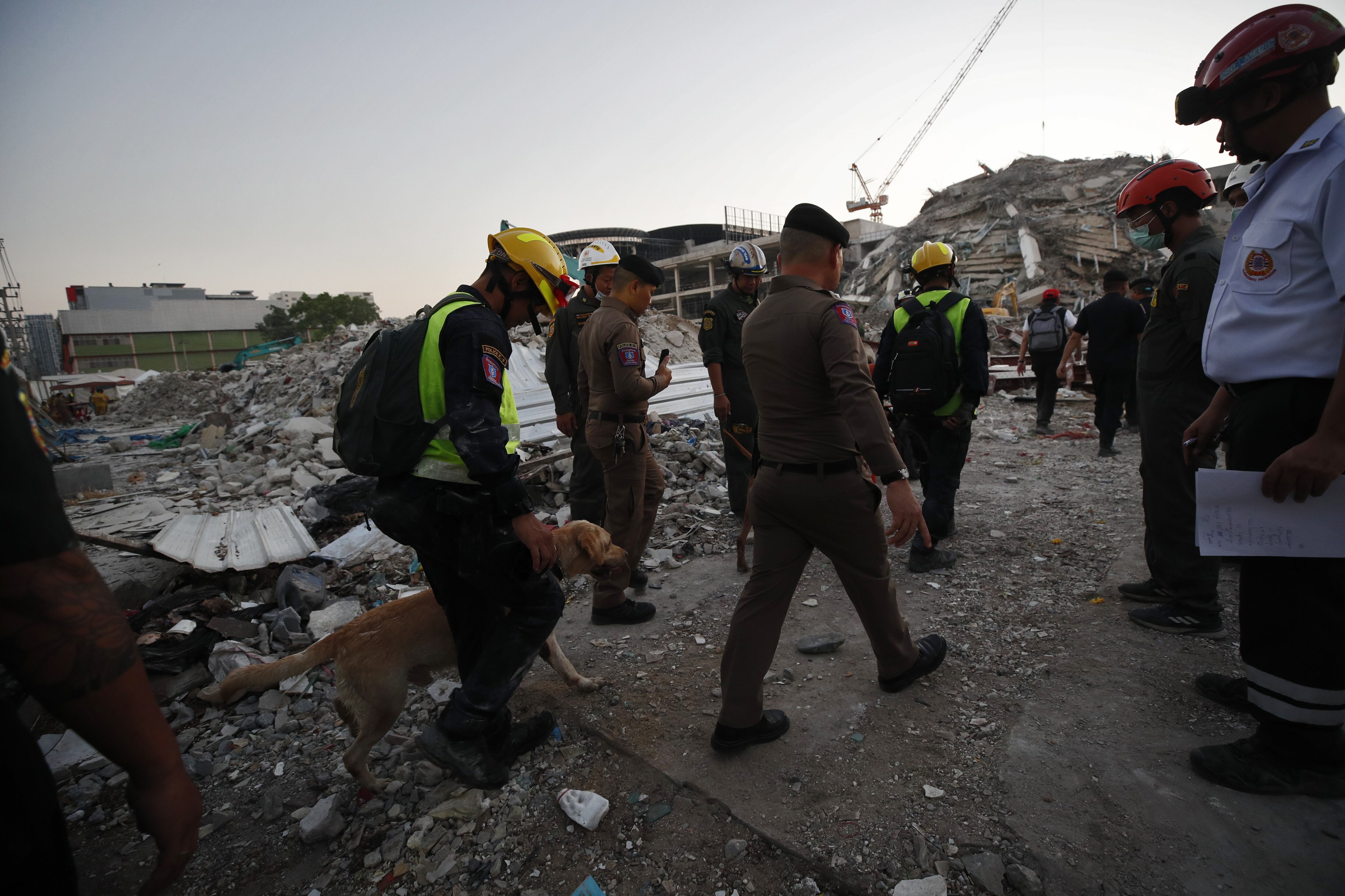 Bangkok (Thailand), 28/03/2025.- Rescue workers search for survivors with sniffer dogs at the site of a collapsed building following an earthquake in Bangkok, Thailand, 28 March 2025. According to the National Institute for Emergency Medicine, 70 construction workers are missing at the site following a 7.7-magnitude earthquake that struck Myanmar and caused tremors that could be felt in neighboring Thailand. (Terremoto/sismo, Birmania, Tailandia) EFE/EPA/RUNGROJ YONGRIT / RUNGROJ YONGRIT