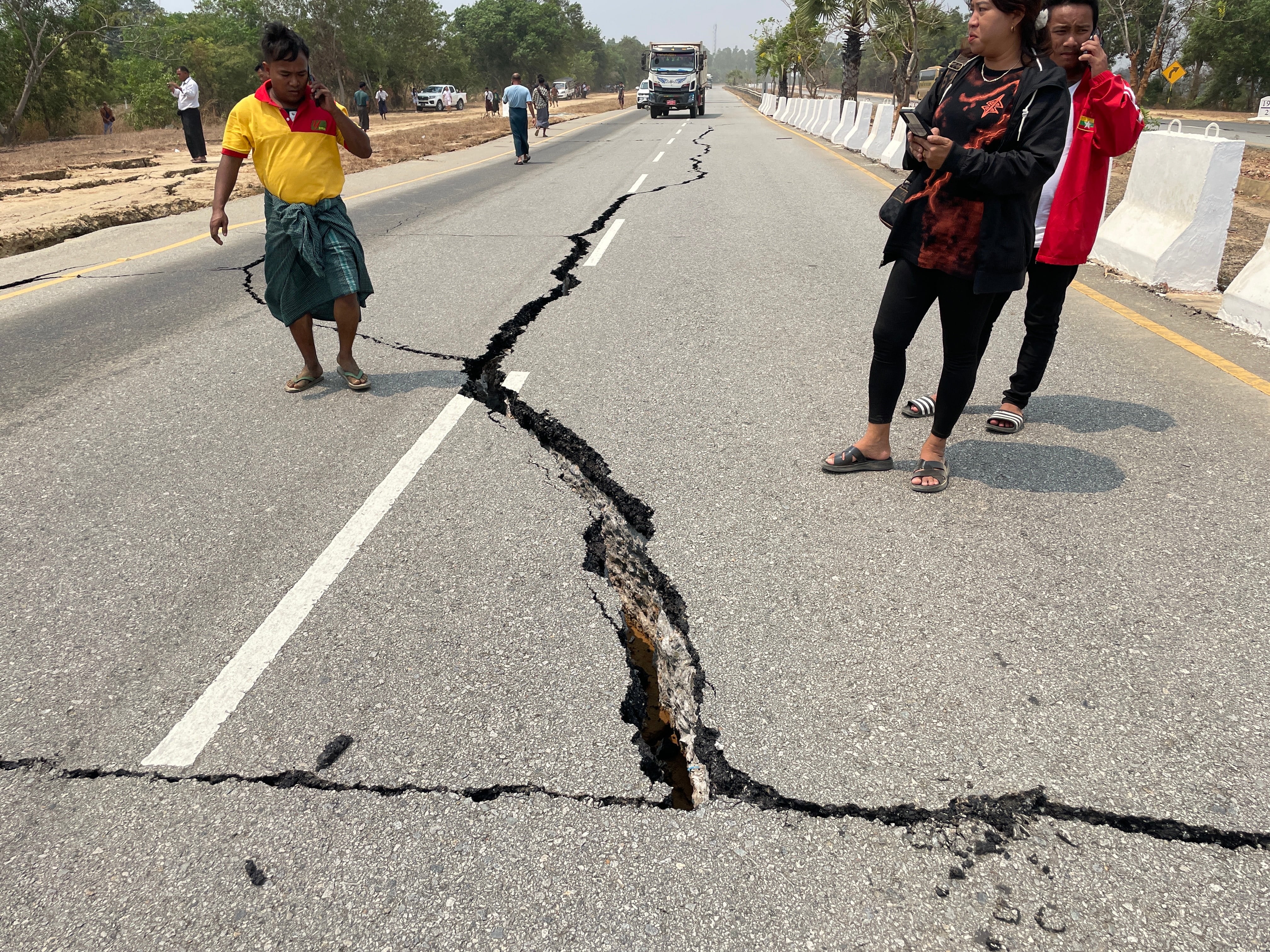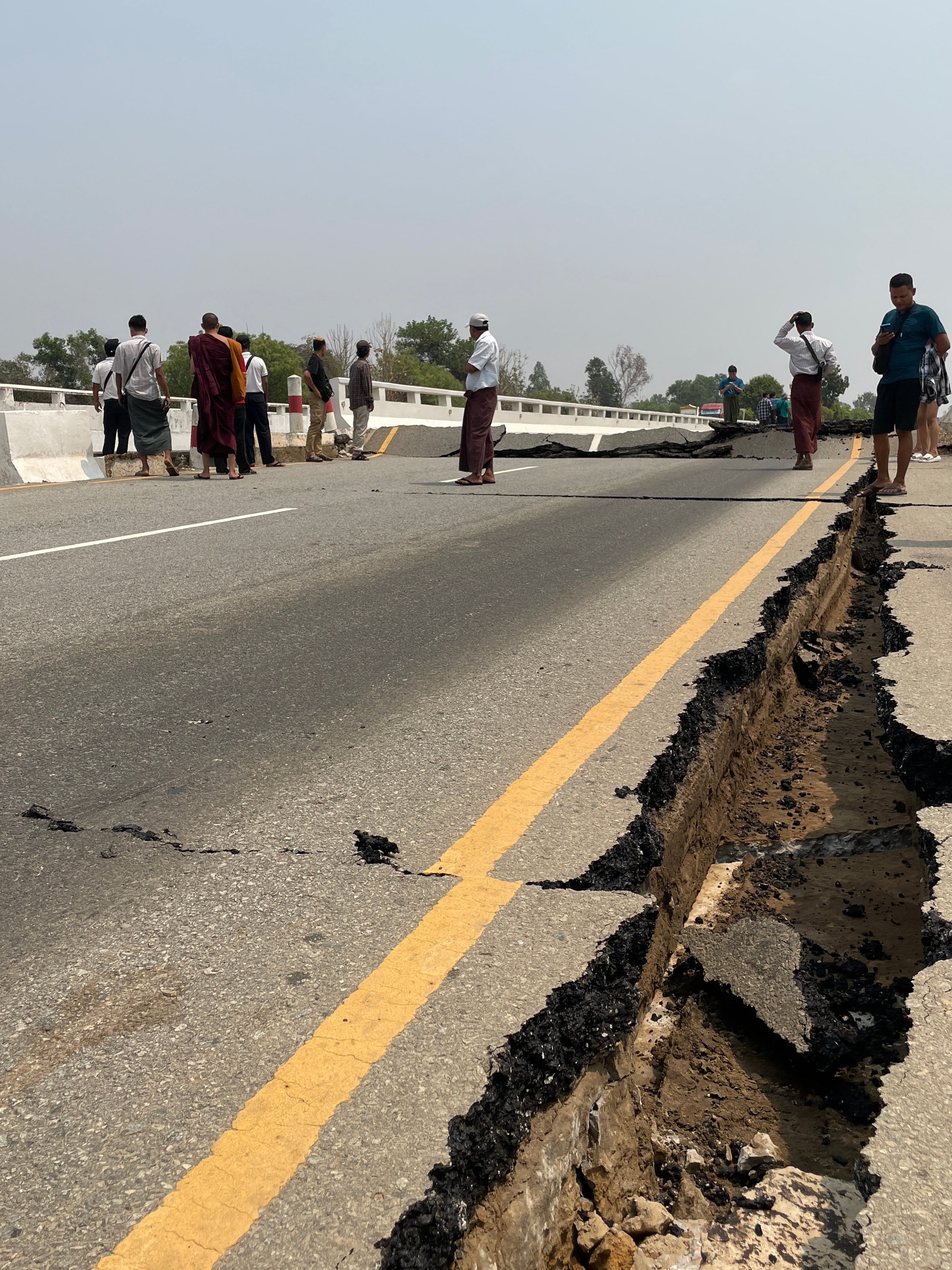 Naypyidaw (Myanmar), 28/03/2025.- People look at a damaged road on the Naypyidaw-Yangon highway after an earthquake, in Naypyidaw, Myanmar, 28 March 2025. A 7.7-magnitude earthquake struck Myanmar, according to the United States Geological Survey (USGS), with tremors felt in neighboring countries (Terremoto/sismo, Birmania, Estados Unidos) EFE/EPA/NYEIN CHAN NAING / NYEIN CHAN NAING