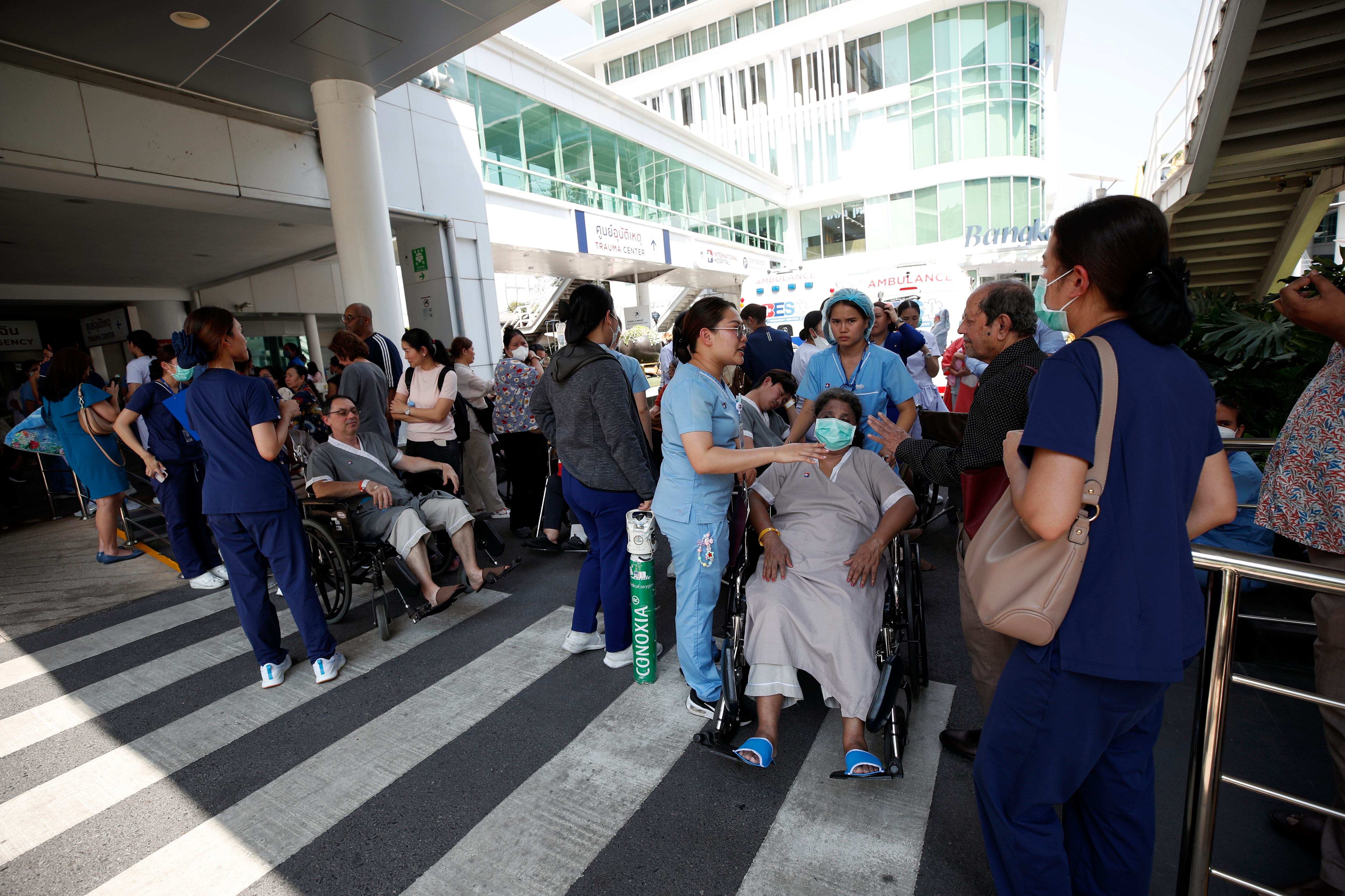 Bangkok (Thailand), 28/03/2025.- Patients and medics are evacuated after an earthquake, at a hospital in Bangkok, Thailand, 28 March 2025. A 7.7-magnitude earthquake struck Myanmar, according to the United States Geological Survey (USGS), with tremors felt in neighboring Thailand. (Terremoto/sismo, Birmania, Tailandia, Estados Unidos) EFE/EPA/RUNGROJ YONGRIT / RUNGROJ YONGRIT