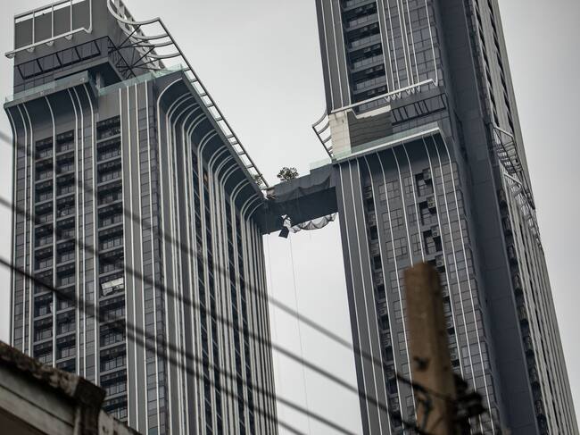 BANGKOK, THAILAND - MARCH 30: The shattered connecting bridge of the luxury 'Park Origin Thonglor' Condominium dangles precariously, a stark symbol of the 7.7-magnitude earthquake's devastating reach from central Myanmar, as Bangkok's skyline bears the scars of Day 3's unrelenting aftermath in Bangkok, Thailand on March 30, 2025. On Day 3, after a 7.7-magnitude earthquake struck central Myanmar on March 28, 2025, Bangkok confronts the widening impact of the disaster. The collapse of a 33-story skyscraper under construction still traps 44 to 87 people, mostly workers, with 10 survivors rescued and faint vital signs detected for about 12. The death toll in Bangkok has risen to 11 as rescue operations persist. Across the city, several condominiums exhibit severe exterior cracks, sparking concerns over additional structural risks as families endure mounting uncertainty. (Photo by Guillaume Payen/Anadolu via Getty Images) / Anadolu