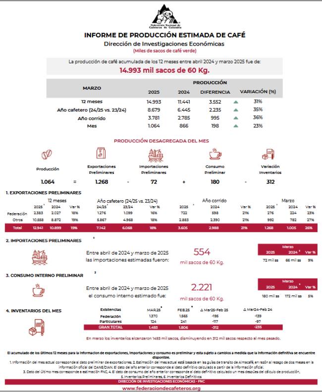 El otro gran resultado se registró en los últimos 12 meses, es decir el periodo que comprende abril del 2024 – marzo del 2025, allí el informe expuso que la producción de café alcanzó los 14.993.000 bultos, cifra superior en 3.552.000 sacos a la que se registró durante el mismo periodo anterior, registrando un crecimiento del 31%.
