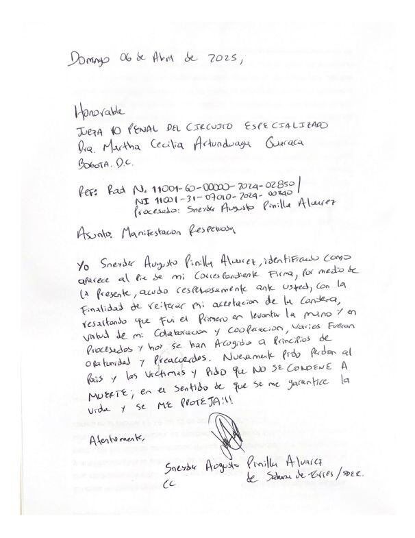 “Acudo ante usted respetuosamente con la finalidad de reiterar mi aceptación de la condena (…) nuevamente pido perdón a las víctimas y que no se me condene a muerte; en el sentido de que se me garantice la vida y se me proteja”, expresó Pinilla en la misiva dirigida a la juez décima penal del circuito de Bogotá.