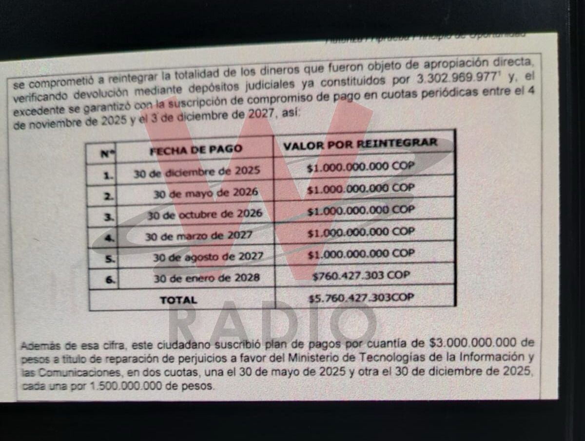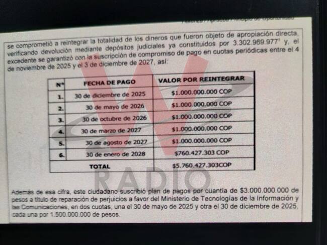 W Radio conoció que Juan Carlos Ángel Cáceres Bayona ya reintegró 3.800 millones de pesos y que los demás pagos se realizarán así: