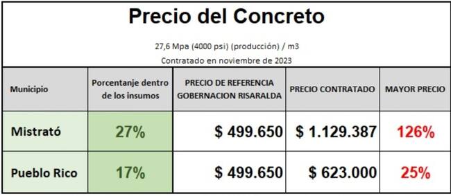 Ahora, Giraldo también denunció presuntos sobrecostos en materiales y dijo que, en Mistrató se pagaron a $1.100.000 el metro cúbico de concreto, pero el valor de referencia inicial en Risaralda era de $500.000. Y en Pueblo Rico, el valor fue de $623.000.