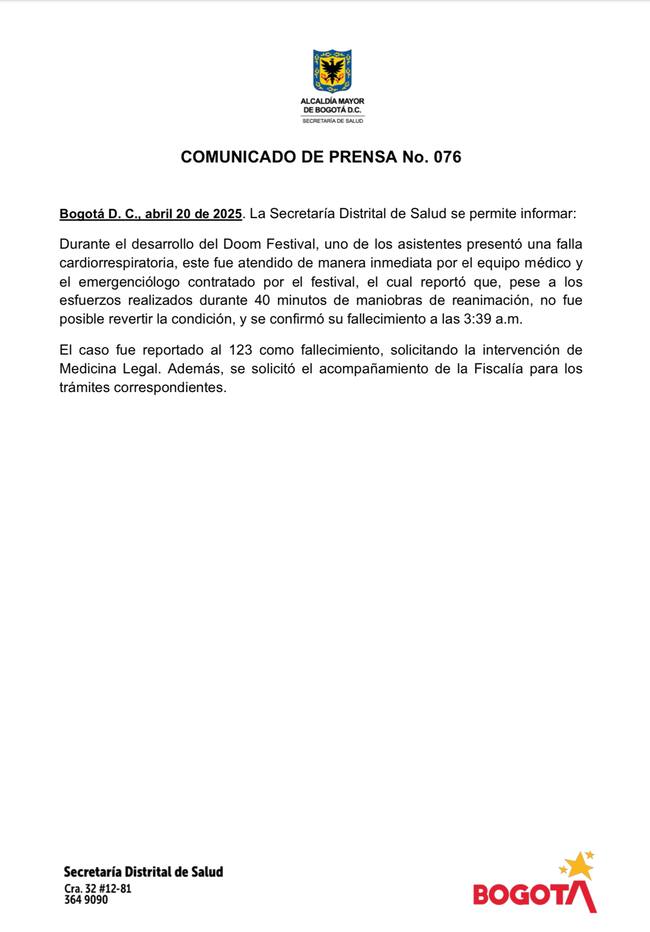 Por medio de un comunicado, la Secretaría de Salud de Bogotá confirmó las causas de la muerte de uno de los asistentes en el Doom Festival que se desarrolló en la capital del país.
