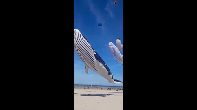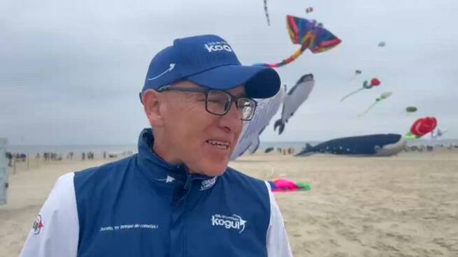 Algunas de estas ballenas provenían de Colombia. “Son cometas inflables, actúan como un globo, se llenan de aire, y el viento hace que suban, están acomodadas en una cuerda y están jaladas por una cometa que está más arriba, es una línea donde se cuelgan varas cometas”, explicó a La W Jorge Beltrán.