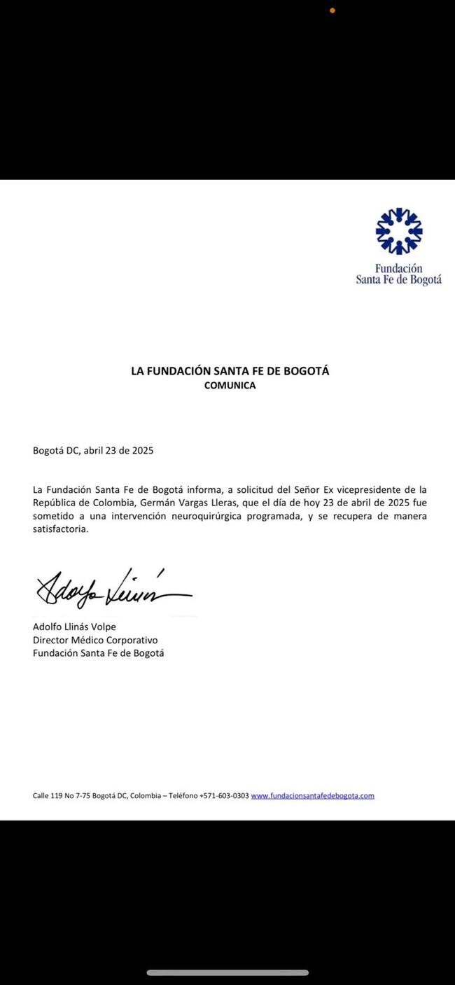 La Fundación Santa Fe informó este miércoles, 23 de abril, que el ex vicepresidente Germán Vargas Lleras fue intervenido quirúrgicamente para una operación neuroquirúrgica previamente programada.