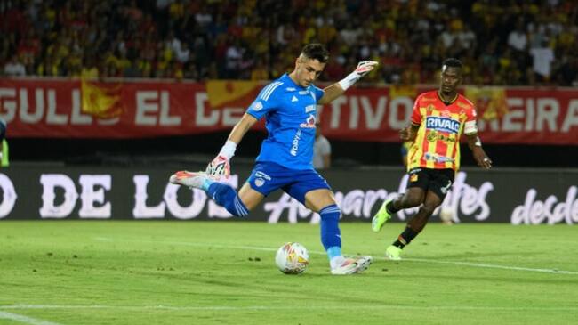 Remate parado a la escuadra izquierda. Yeison Suárez (Deportivo Pereira) remate con la izquierda desde fuera del área.