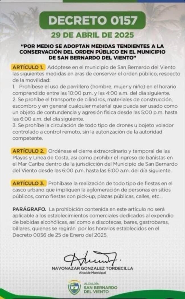 Mientras, en San Bernardo del Viento, zona costanera de Córdoba, el alcalde Navonazar González no solo restringió el uso de parrillero en un horario determinado, sino que también ordenó el cierre extraordinario y temporal de las playas.