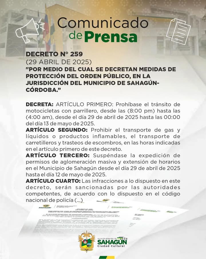 Por su parte, en el municipio de Sahagún, el alcalde Jairo Balmaceda adoptó las siguientes disposiciones: