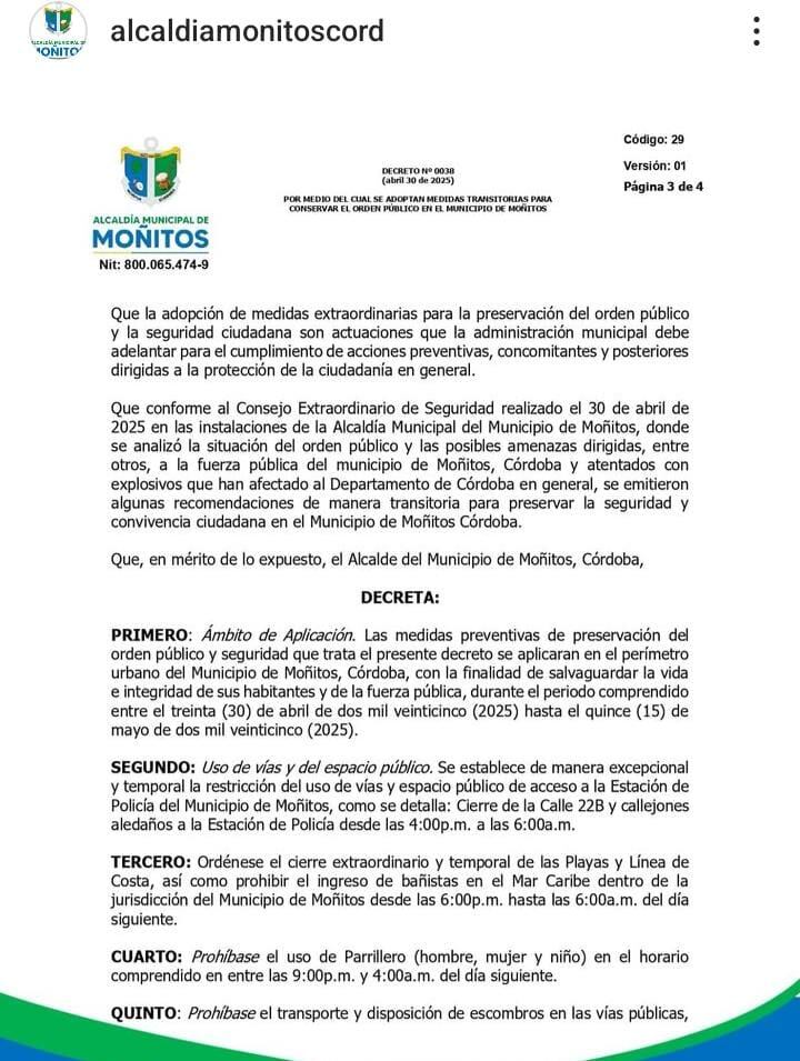 Mientras, en San Bernardo del Viento se restringió la circulación con parrillero desde las 10:00 p.m. hasta las 4:00 a.m. En esta zona costanera de Córdoba también se ordenó el cierre temporal y extraordinario de las playas.