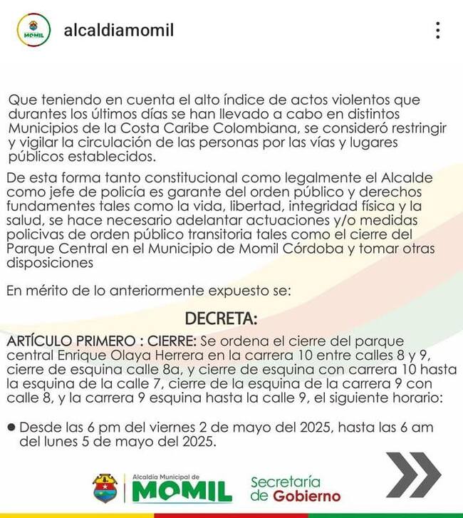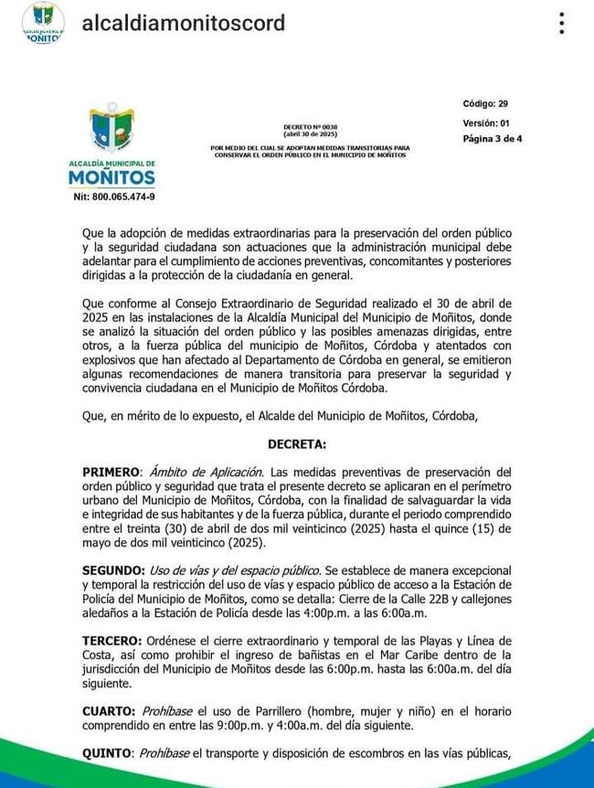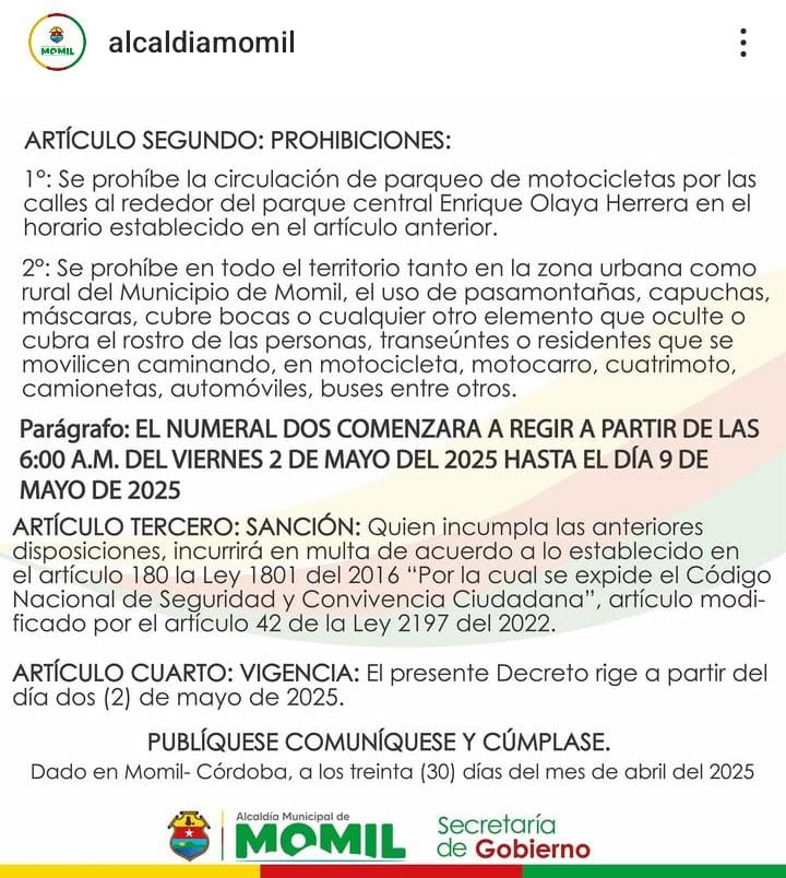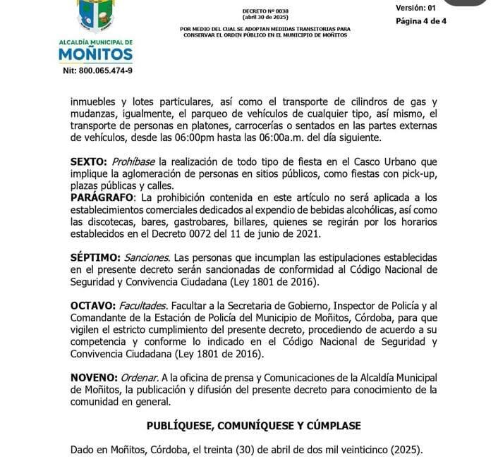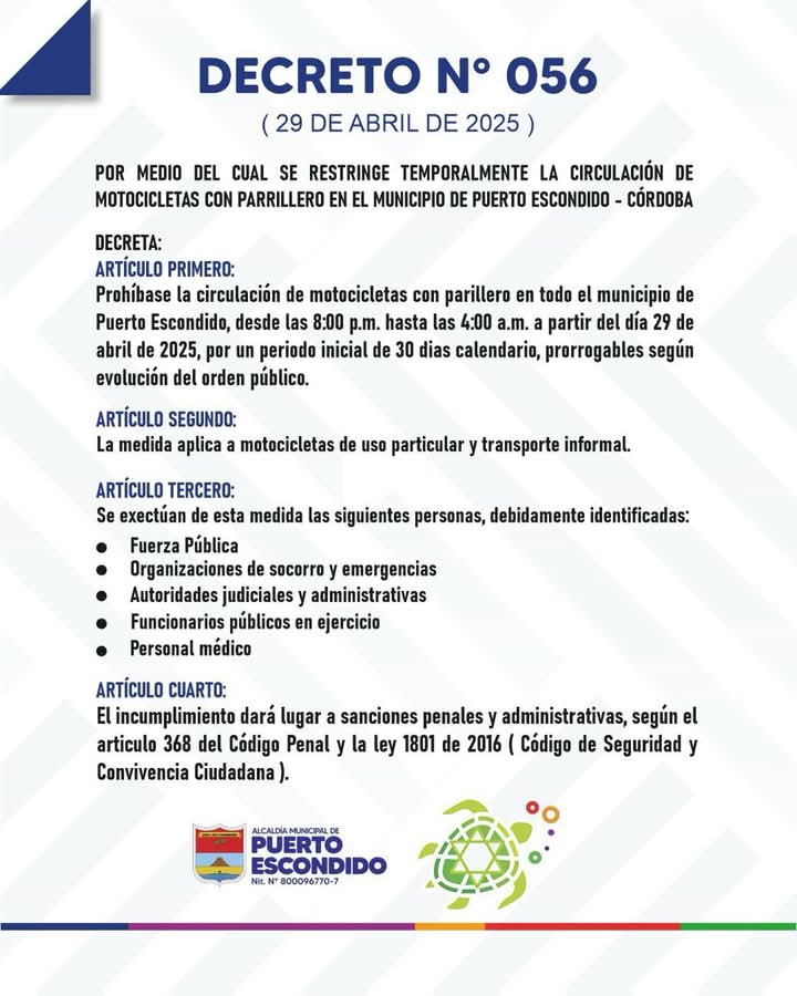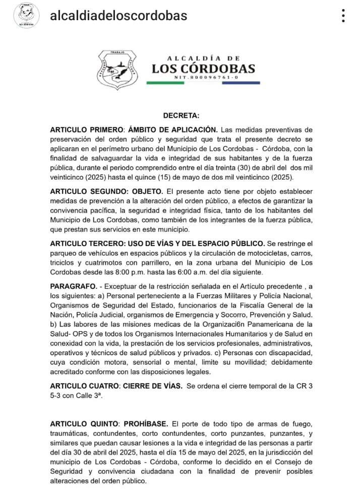 Por su parte, en Sahagún se prohibió el parrillero en motocicleta desde el 29 de abril hasta el 13 de mayo de 2025, en el horario de 8:00 p.m. hasta las 4:00 a.m. del día siguiente. Asimismo, se suspendieron los permisos para eventos que generen aglomeración en el municipio.