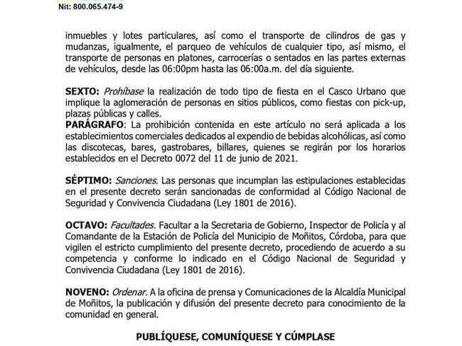 En el caso de Planeta Rica, el alcalde Ramón Calle dijo que “estamos prohibiendo parrillero de 6:00 p.m. a 6:00 a.m. Igualmente, tránsito pesado en el mismo horario (de 6:00 p.m. a 6:00 a.m.); pero hemos tenido una condescendencia con el sector comercial porque no decretamos ley seca; sino que vamos a tener un horario normal para que la gente pueda disfrutar. Vamos a rodear a nuestra fuerza pública”.