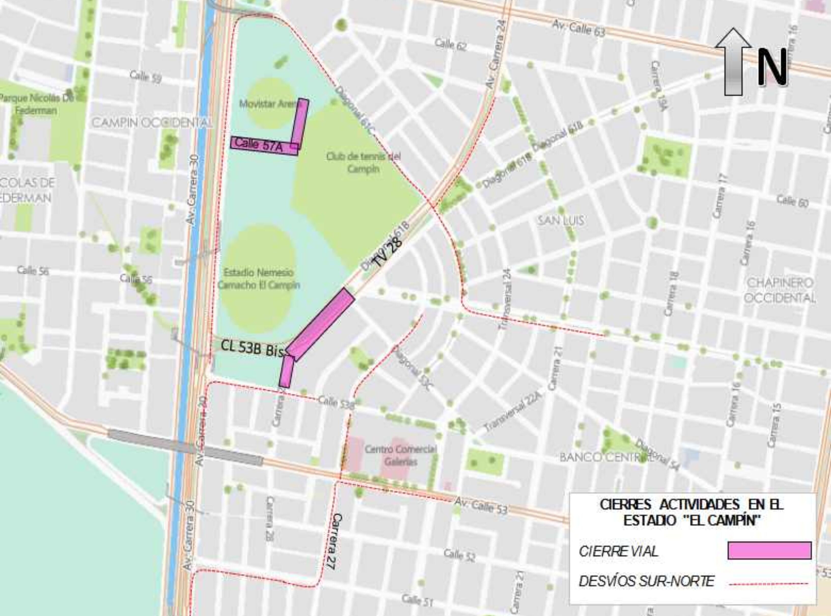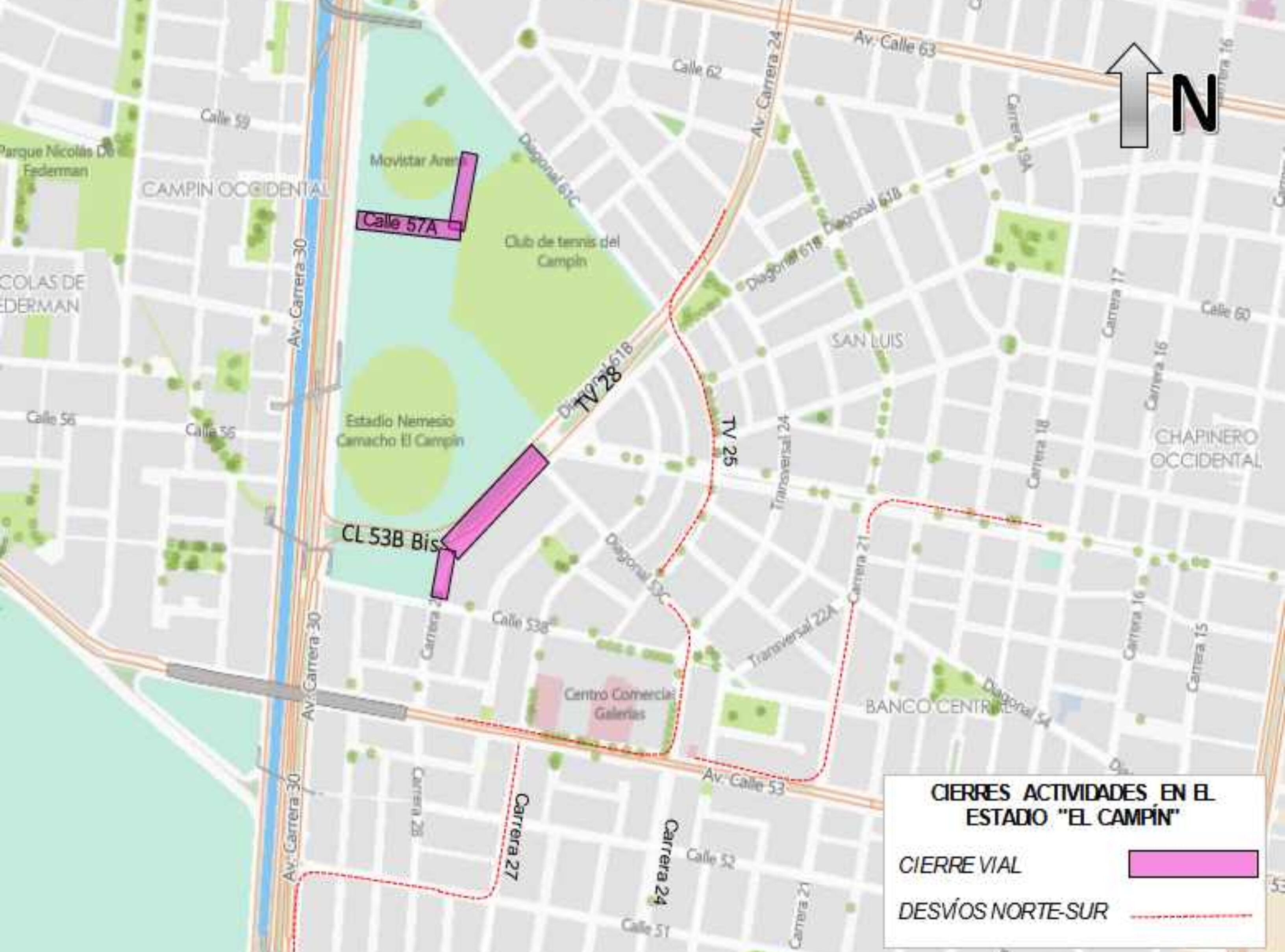 - Cierre total de la carrera 28 entre calle 53B Bis y calle 53B. Se deberá implementar el carril de acceso controlado a los residentes de la transversal 28 (costado oriental) entre calle 53B Bis y avenida calle 57.