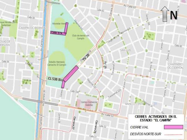 - Cierre total de las dos calzadas de la transversal 28 entre la carrera 28 y la avenida calle 57, incluido el sendero peatonal del costado occidental. El organizador deberá implementar carril de acceso y salida controlada para los residentes del costado oriental.