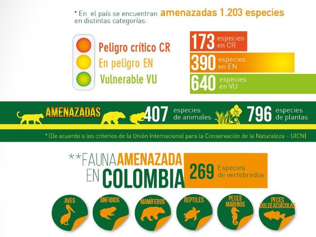 El Ministerio de Ambiente, en su más reciente informe de especies amenazadas en Colombia, informó que según aportes de la Policía Nacional, se encuentran amenazadas 1.203 especies en distintas categorías.
