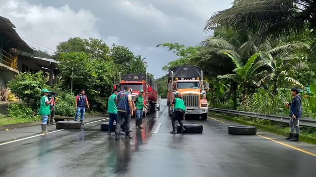 Los bloqueos se presentan en los sectores de Cisneros y La Delfina, donde los manifestantes han atravesado camiones en la vía, impidiendo totalmente el paso vehicular.