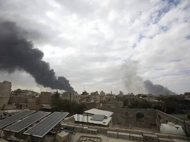 Humo en edificios tras los ataques aéreos israelíes en Saná, Yemen. Foto: EFE/EPA/YAHYA ARHAB