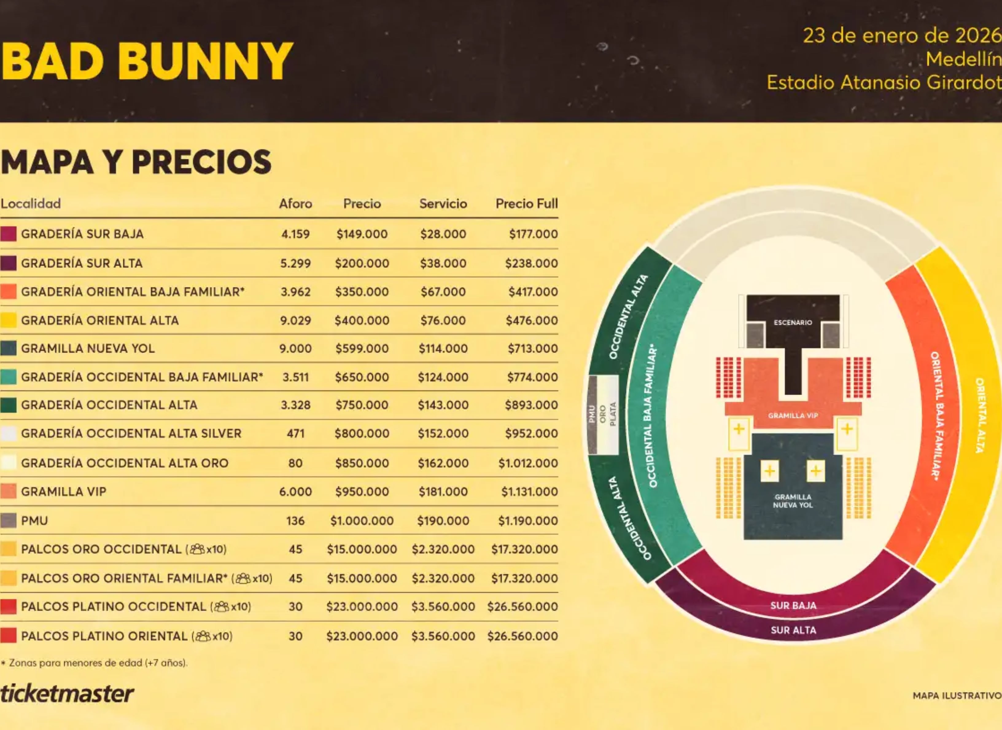 Precios de entradas concierto Bad Bunny, Medellín 2026. Imagen: Ticketmaster