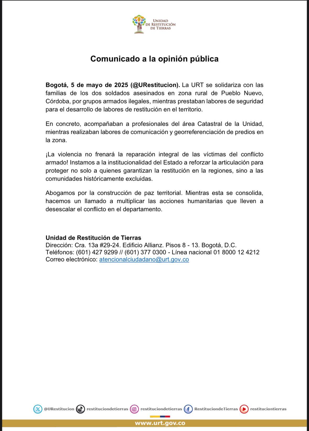 “Como consecuencia de esta cobarde acción terrorista, que viola los derechos humanos, perdieron la vida los soldados profesionales Mauricio José Pertuz Cabarcas y Mario Alberto Pérez González. De inmediato, la Unidad estableció un dispositivo de seguridad en el área y es apoyada para adelantar los actos urgentes”, puntualizó.