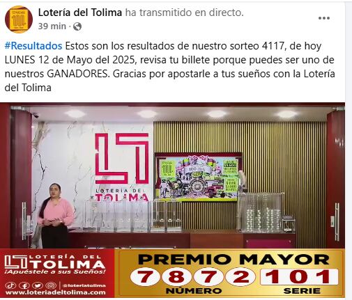Resultado del premio mayor de la Lotería del Tolima del día lunes mayo 12. Foto: Captura de pantalla de la Transmisión de Facebook de la Lotería del Tolima.