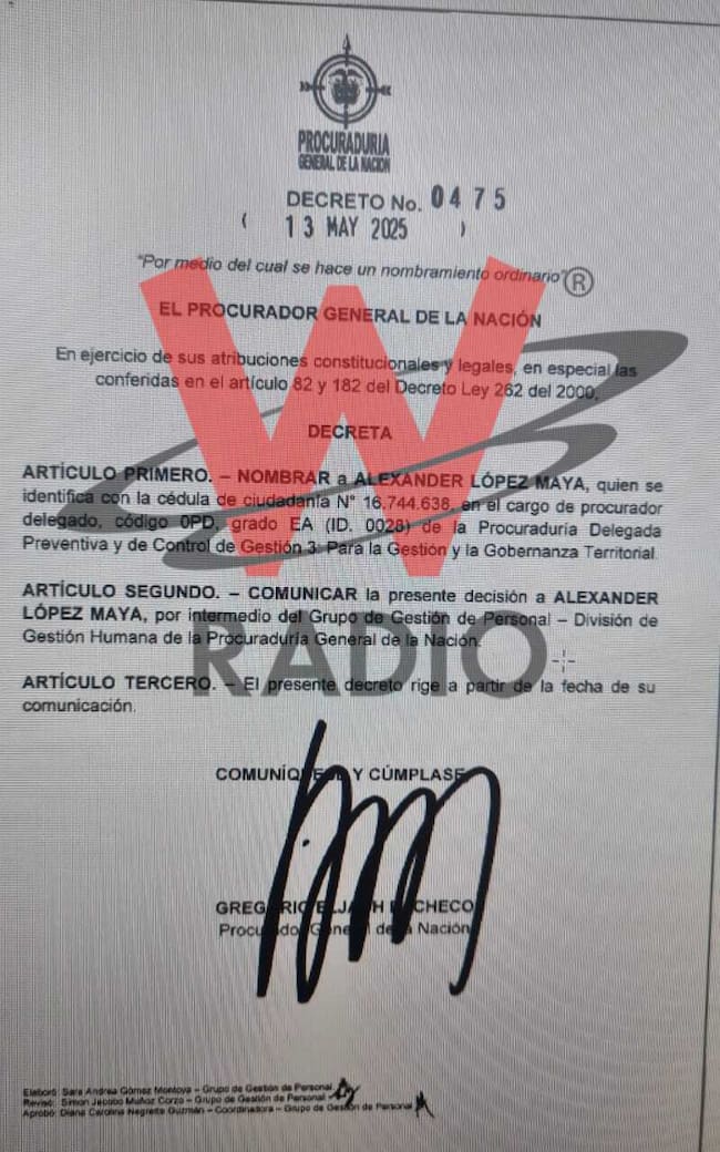“El procurador general de la Nacional decreta nombrar a Alexander López Maya como procurador delegado para la Gestión y la Gobernanza Territorial”, mencionó Juan Pablo Calvas.