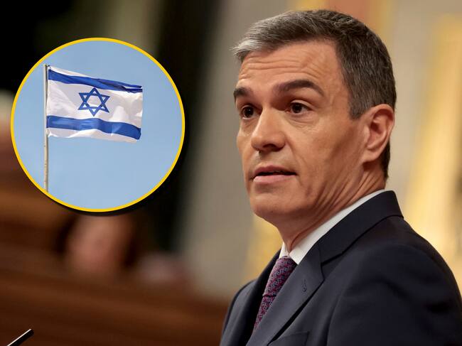 Pedro Sánchez y bandera de Israel. Foto: Juan Carlos Rojas/picture alliance y Nick Brundle vía Getty Images.