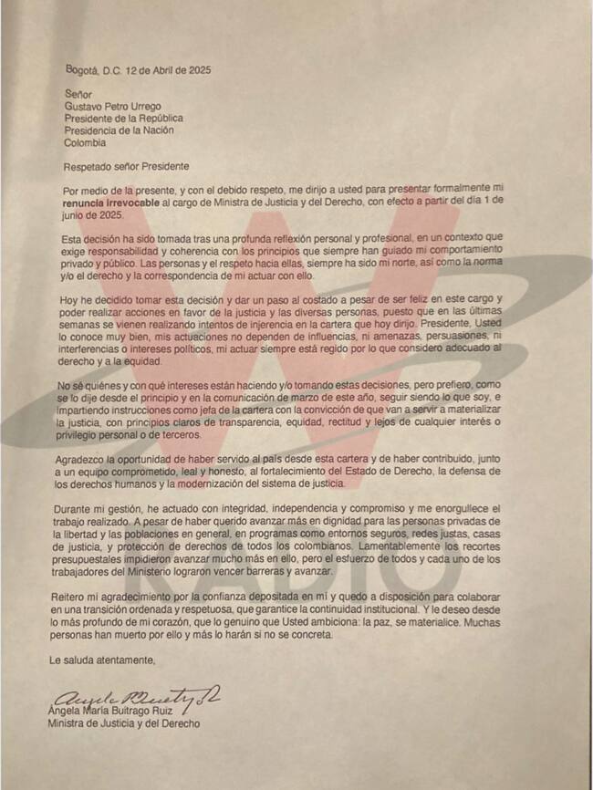 Carta de renuncia de la ministra de Justicia, Ángela María Buitrago.