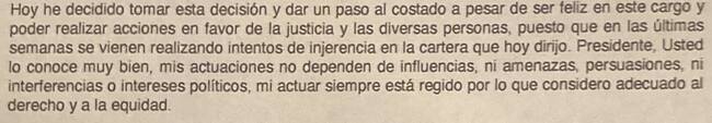 La carta de dimisión señala textualmente que “en las últimas semanas se vienen realizando intentos de injerencia en la cartera que hoy dirijo”.