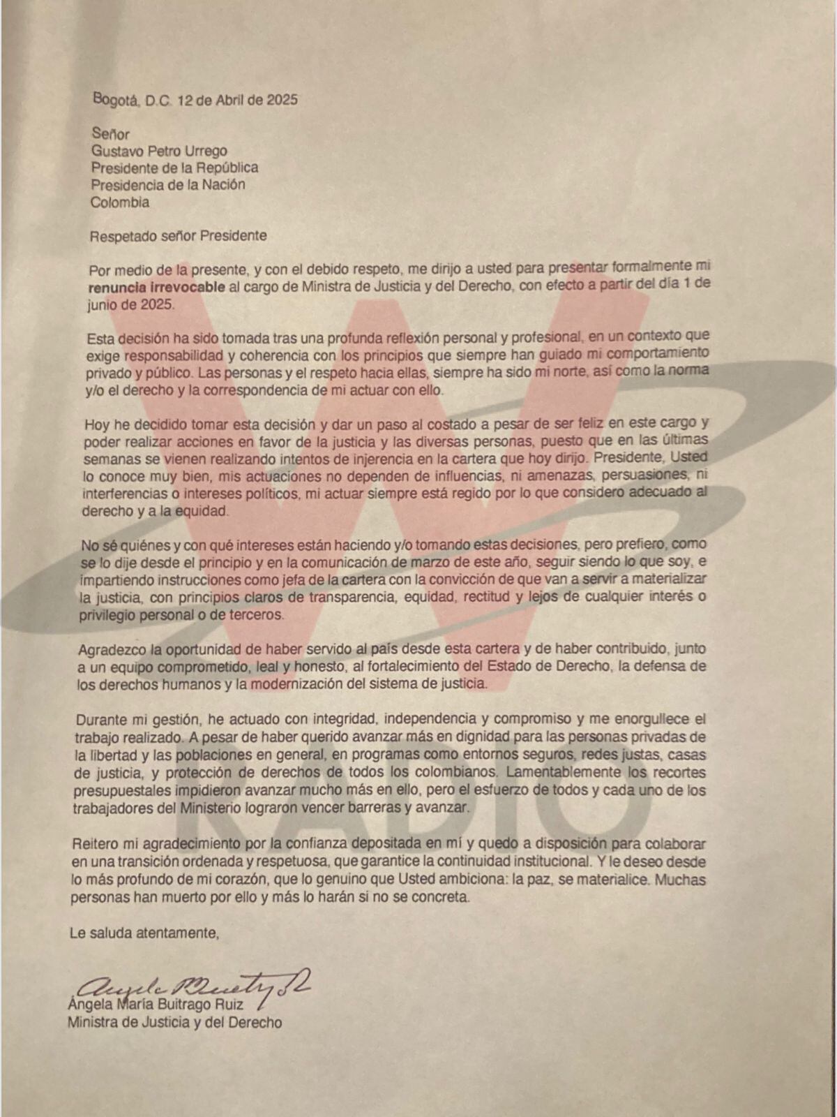 En las últimas horas, el presidente Gustavo Petro recibió la renuncia irrevocable de la señora ministra de Justicia, Ángela María Buitrago.