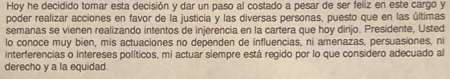 La carta de dimisión señala textualmente que “en las últimas semanas se vienen realizando intentos de injerencia en la cartera que hoy dirijo”.