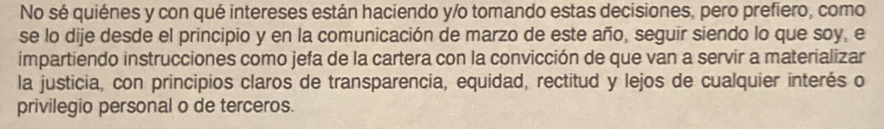 Es decir, al menos desde marzo, algo venía pasando con ella en el Gobierno y se agravó en las últimas semanas con lo que la ministra llama en su carta “intentos de injerencia”. Al parecer, alguien estaba tratando de meterse en los asuntos del Ministerio de Justicia.