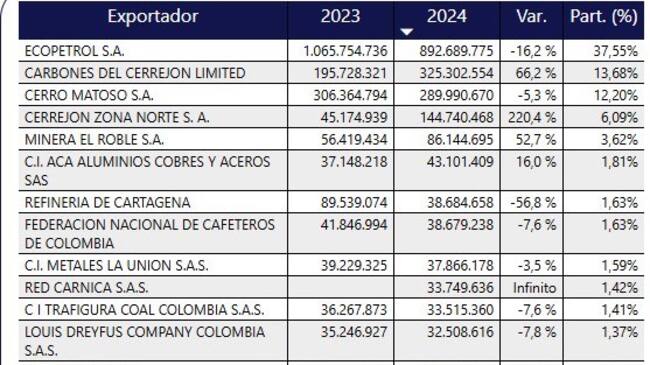 Le sigue Carbones del Cerrejón Limited, que tuvo un crecimiento destacado del 66,2%, alcanzando 325,3 millones de dólares. Cerro Matoso S.A. figura como el tercer actor más fuerte, con 289,9 millones en exportaciones.