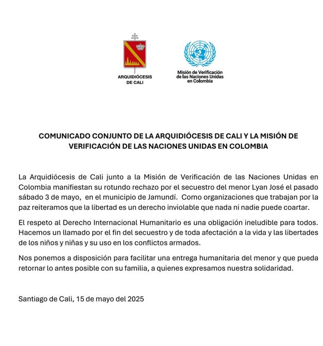 La Arquidiócesis de Cali y la Misión de Verificación de las Naciones Unidas en Colombia, insistieron en su llamado para que sea liberado el niño de 11 años secuestrado en el corregimiento de Potrerito, zona rural de Jamundí, el pasado 3 de mayo.