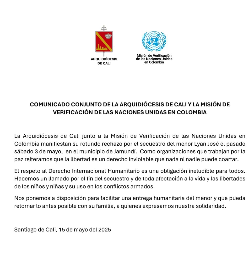 La Arquidiócesis de Cali y la Misión de Verificación de las Naciones Unidas en Colombia, insistieron en su llamado para que sea liberado el niño de 11 años secuestrado en el corregimiento de Potrerito, zona rural de Jamundí, el pasado 3 de mayo.