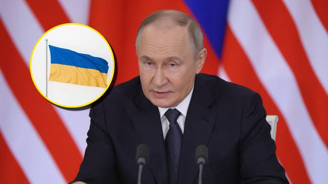 Putin y bandera de Ucrania. Foto: Contributor/ Wong You Liang vía Getty Images